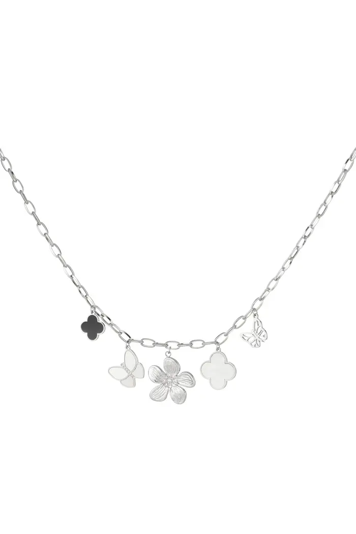 Hoe leuk is deze clover charm necklace? Een must voor jouw necklace party. De ketting is gemaakt van stainless steel, enamel, zeeschelp en strass steentjes. De afmeting van de ketting is 39 centimeter en hij is 5 centimeter te verstellen.